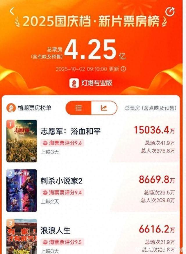 发布日期:2025-10-31 08:17 点击次数:64 10部新片激战国庆档,谁有赢家之姿? 据灯塔专业版数据,截至10月2日上午9时,2025年国庆档票房达4.25亿元,《志愿军:浴血和平》《刺杀小说家2》《浪浪人生》暂列票房前三。